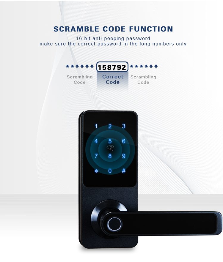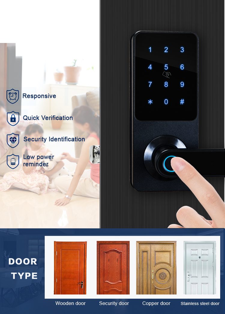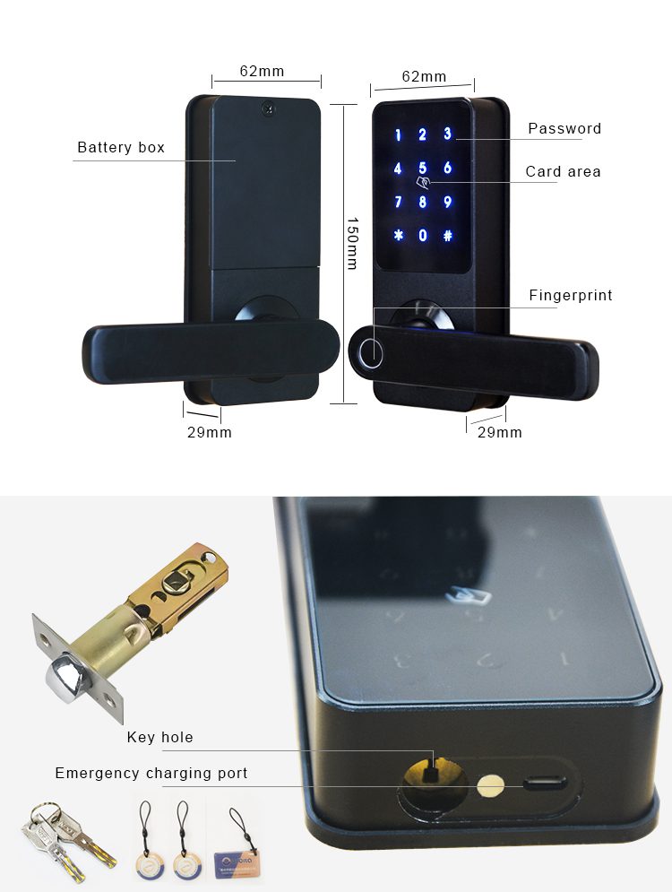 - Unlock WaysFingeprint, Password, Card,Key, Bluetooh(BLE4.1 and above), APP